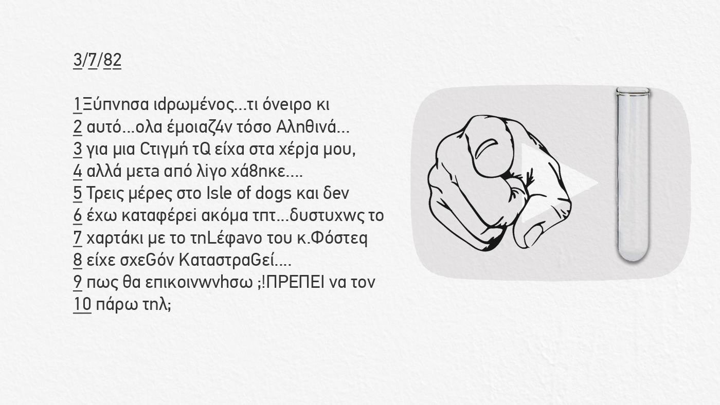 Ήταν η τελευταία μου μέρα στο Isle of dogs… Πλέον έχω το σημείωμα του Φόστερ ,το πετράδι που πήρα από το σπίτι του κ ένα κλειστό κουτί…Νομίζω ότι το κουτί θα μου δώσει απαντήσεις και ίσως καποιο έξτρα κομμάτι για την υπόθεση μου…..χαζεύω το πετράδι …σα να γράφει κάτι μέσα…ίσως αυτό να ανοίγει το κουτί….