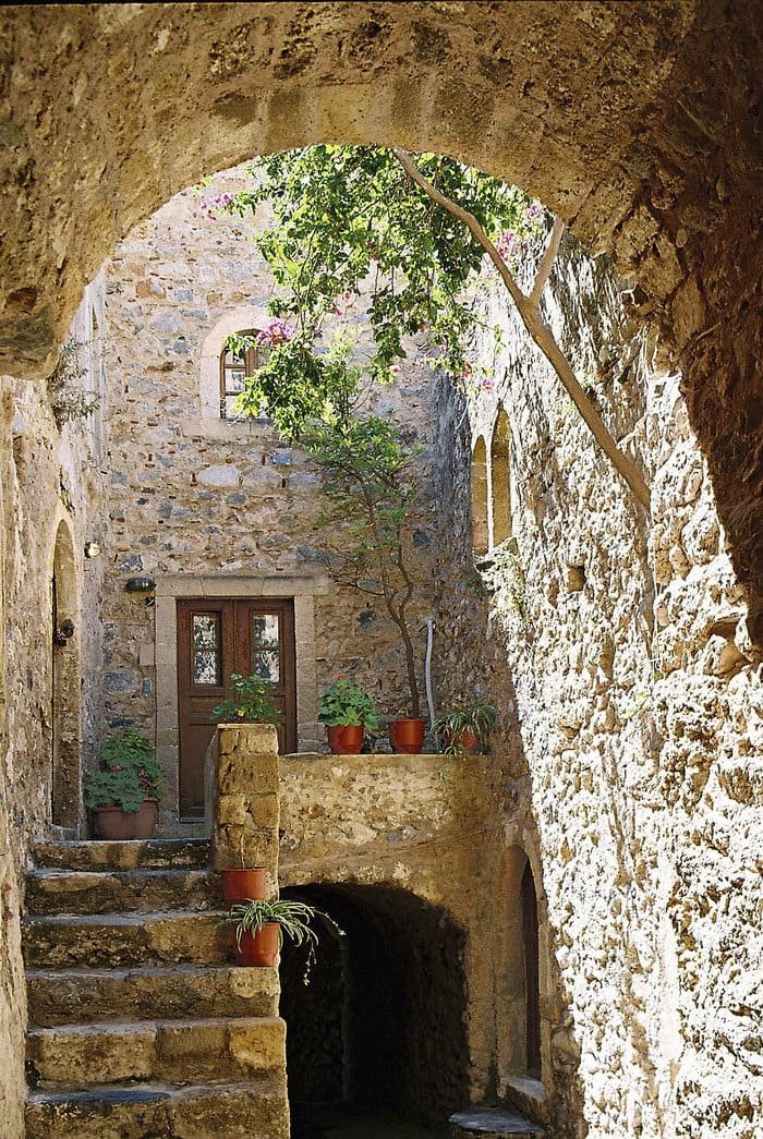 Ανεβαίνοντας τα σκαλιά που αρχίζουν αριστερά μετά το μικρό τούνελ της πύλης και θα βρεθείς στο σπίτι του ποιητή Γιάννη Ρίτσου, με τη βεράντα που κρέμεται πάνω από το Μυρτώο πέλαγος.