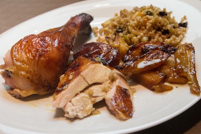 Τέλος, κόβουμε το κοτόπουλο σε 6 μερίδες στο τραπέζι και σερβίρουμε με πατάτες, γέμιση και λίγη σάλτσα από πάνω.