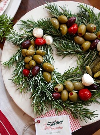 Σε μια πιατέλα της αρεσκείας μας φτιάχνουμε με τα κλαδιά του δεντρολίβανου ένα στεφάνι. Στολίζουμε από πάνω όλα τα υλικά μας με τελευταία τα μοτσαρελίνια ώστε να μας δώσουν ένα επιθυμητό αποτέλεσμα. Αν δεν βρούμε στην αγορά πιπεριές με γέμιση τυριού(πωλούνται έτοιμες στο τμήμα με τα τουρσί των καταστημάτων)μπορούμε να αντικαταστήσουμε με τοματίνια ή κόκκινες πιπεριές φλωρίνης.