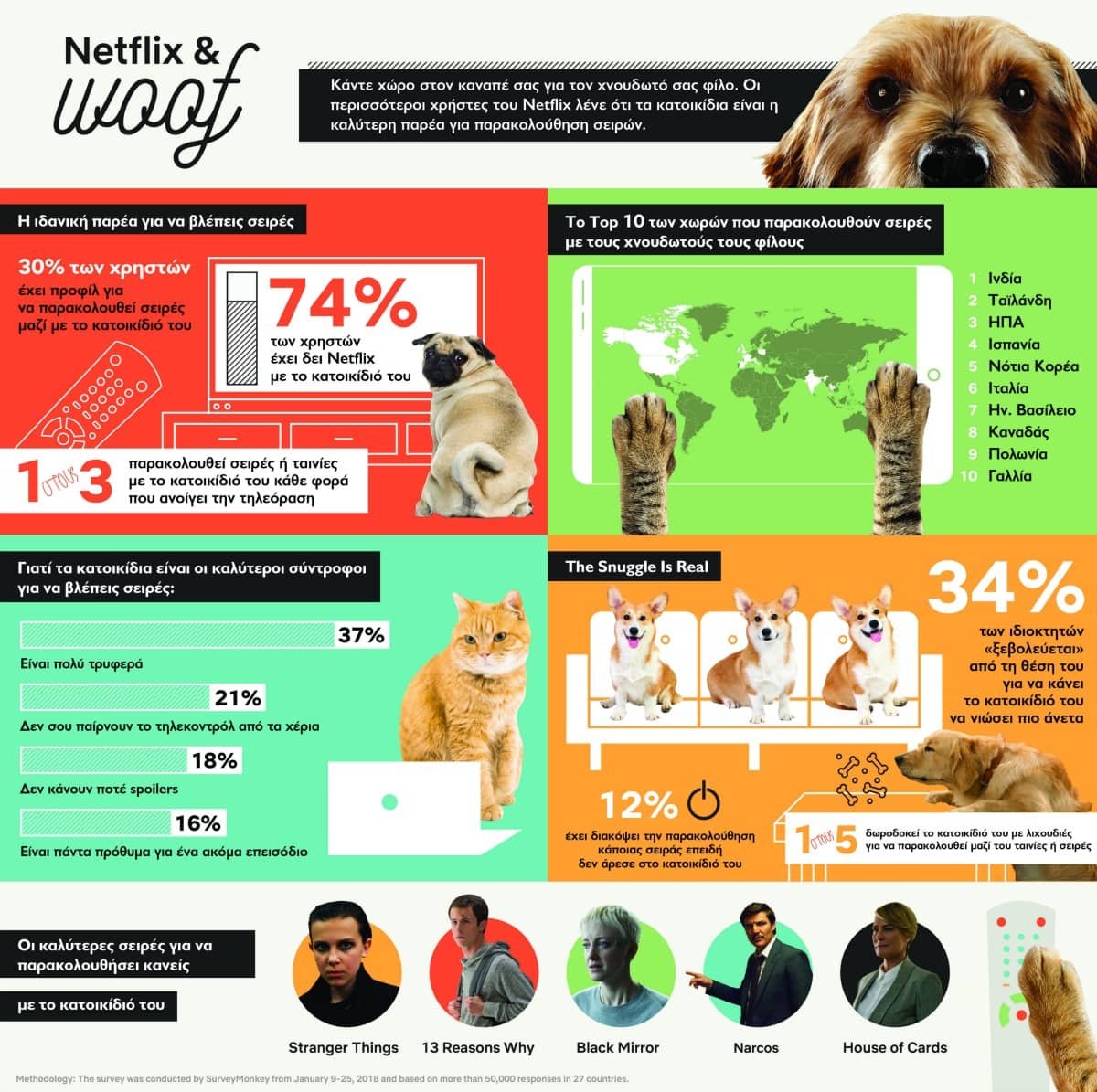 Έρευνα του Netflix σε 27 χώρες κατέληξε στο συμπέρασμα ότι το 58% των τηλεθεατών θεωρεί τα κατοικίδιά του ιδανική παρέα για να βλέπει σειρές. Μάλιστα το 30% των χρηστών του Netflix έχει φτιάξει και ξεχωριστό προφίλ στην πλατφόρμα για να παρακολουθεί τηλεόραση μαζί τους.