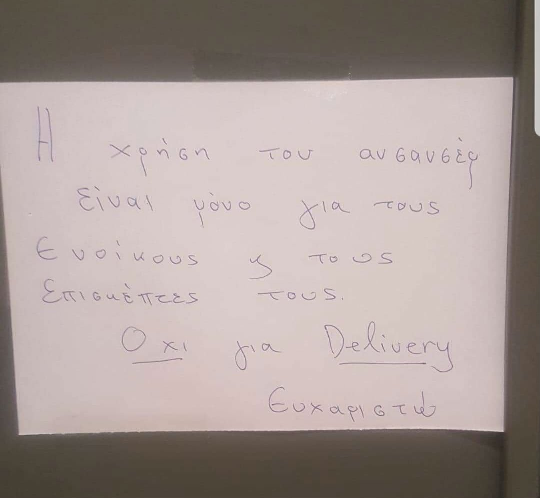 Αυτό λοιπόν, το οποίο προφανώς είναι γραμμένο από τον διαχειριστή, ενημερώνει τους ντελιβεράδες πως απαγορεύεται να πάρουν το ασανσέρ, προκειμένου να παραδώσουν την παραγγελία τους.