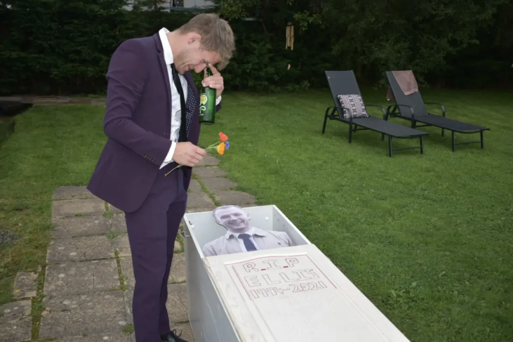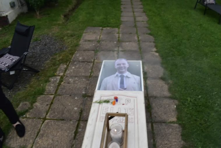 Το κερασάκι πάντως στην τούρτα ήταν ξεκάθαρα το – παραπάνω από – αληθοφανές φέρετρο που έφτιαξαν και το οποίο έγραφε: