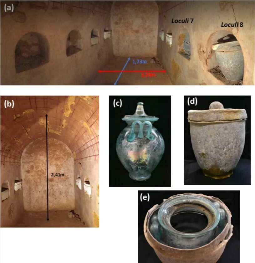 Ο τάφος περιείχε οκτώ ταφικές κόγχες, έξι από τις οποίες έφεραν τεφροδόχους από ασβεστόλιθο, ψαμμίτη ή γυαλί και μόλυβδο. Κάθε τεφροδόχος περιείχε τα αποτεφρωμένα υπολείμματα οστών από ένα μεμονωμένο άτομο και δύο από τις τεφροδόχους έφεραν τα ονόματα του νεκρού: Hispanae και Senicio.