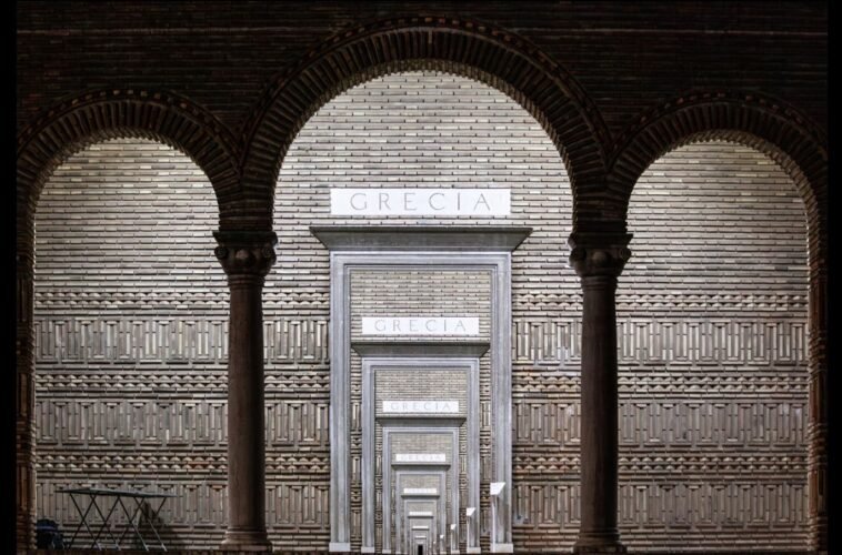 - Το ελληνικό περίπτερο, μια νεοβυζαντινή δομή χτισμένη το 1934, χρησιμοποιείται ως μίνι πειραματικό “σκηνικό”: φέρνει στο παρόν μια αρχιτεκτονική ένταση μέσα στο ίδιο του το πλαίσιο .
