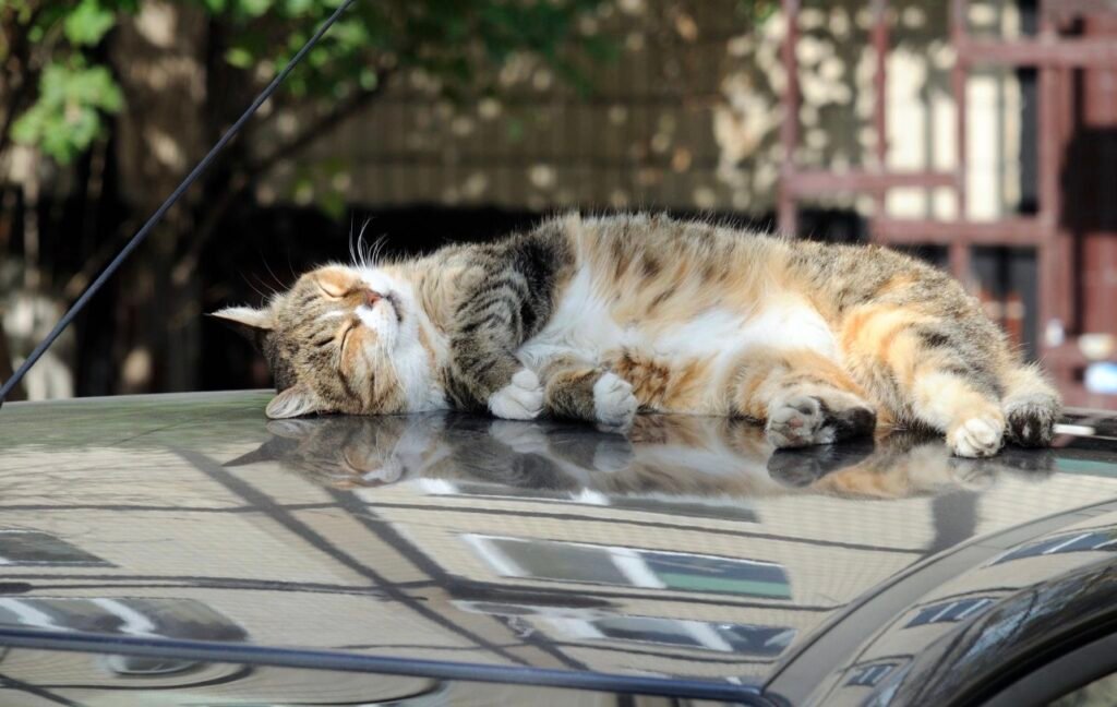 γάτα πάνω σε καπό. Γάτα στην οροφή. Γάτα κουλουριασμένη λες και το αμάξι